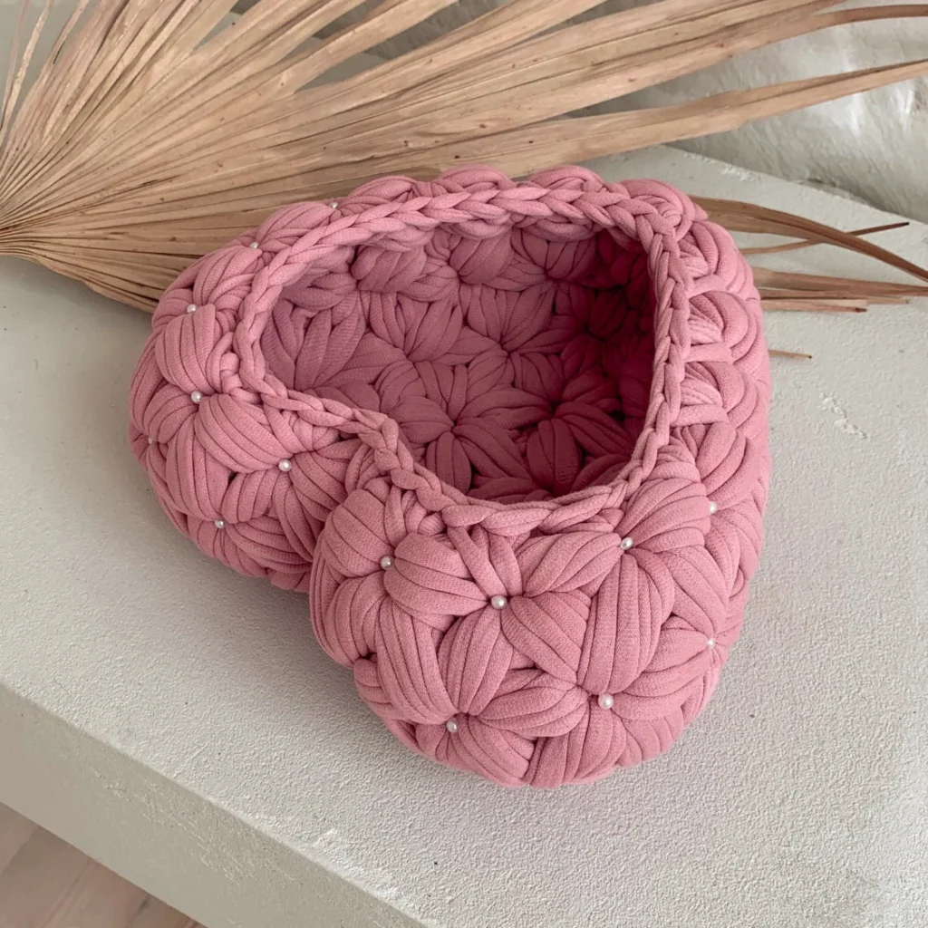 One of the joys of making a Heart-shaped crochet basket with knitted yarn – Crochet Pattern is how many different uses it has. Beyond being practical, it can serve as a decorative piece in any setting.