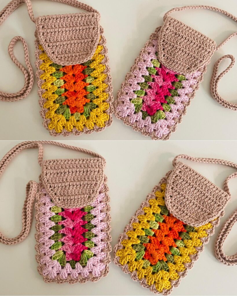 Using multiple colors of yarn, you can design a multicolor cell phone bag that matches your wardrobe or brightens your everyday outfits. The charm of this project lies in the combination of colors and textures that give each bag a unique personality. Moreover, the crochet process itself is relaxing and rewarding—each stitch brings you closer to a beautiful and practical finished product.