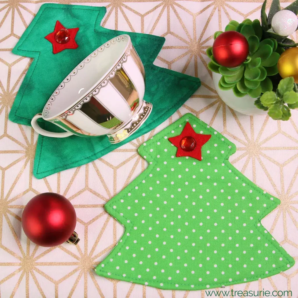 Most coasters range from 4 to 6 inches square. For the Christmas Tree Coasters – Quilt Pattern, 5 to 6 inches gives enough space for the design while still being practical for mugs.