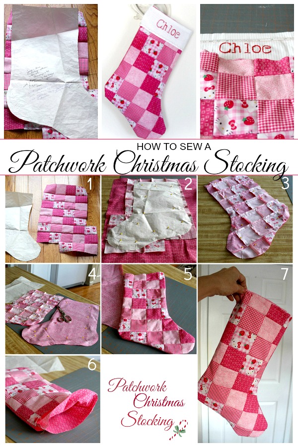 You can use a premade template or draw your own stocking shape. Patchwork designs can be adapted to almost any stocking template.