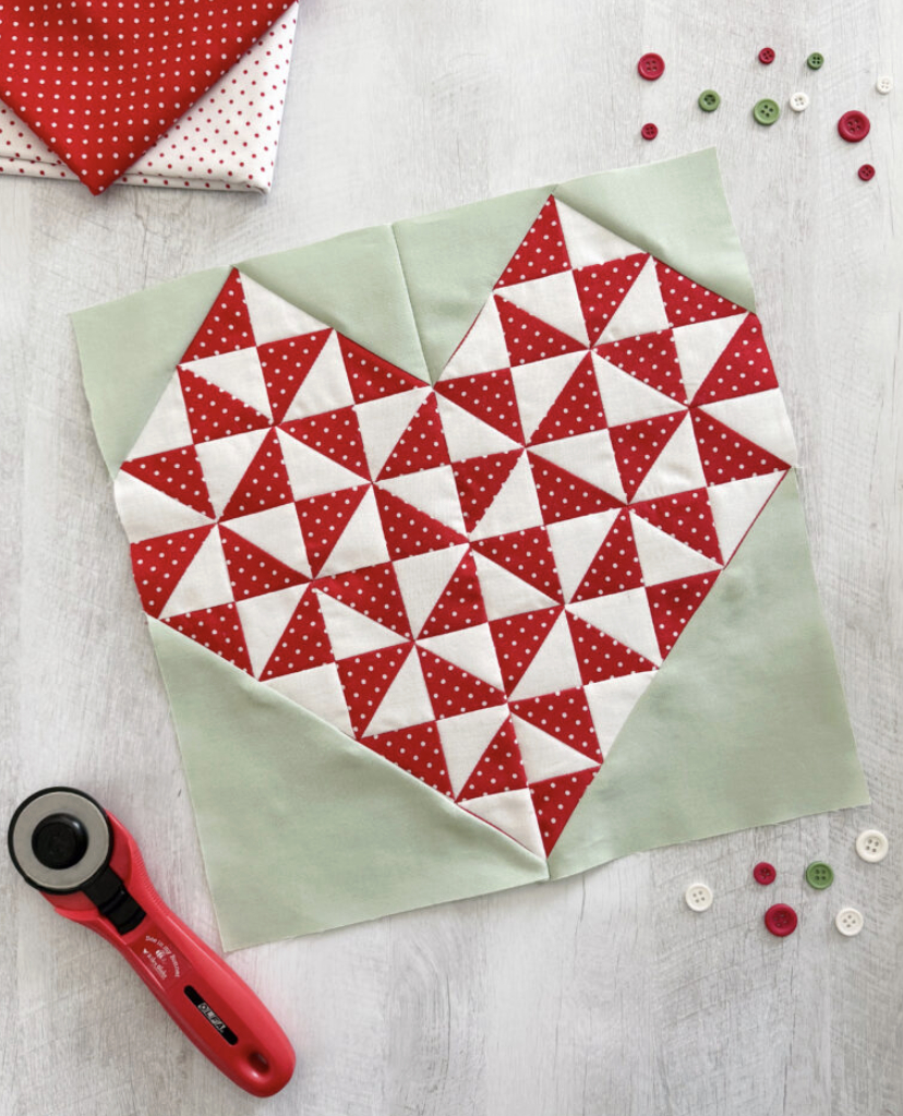 When joining the pinwheel and heart sections, be patient and adjust your alignment as needed. Because the block has several visual focal points, small misalignments can be noticeable. A few pins and slow stitching help achieve accuracy.